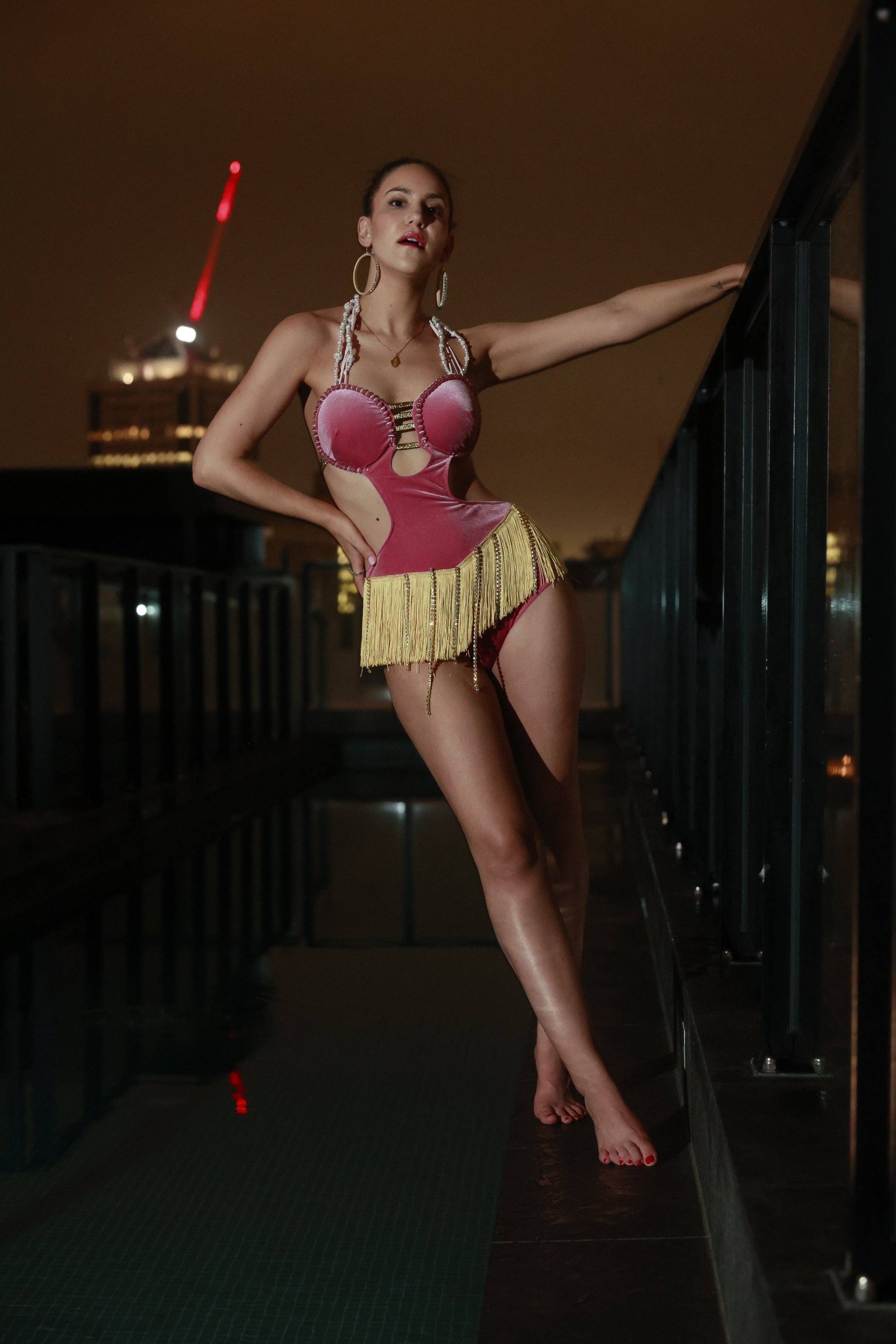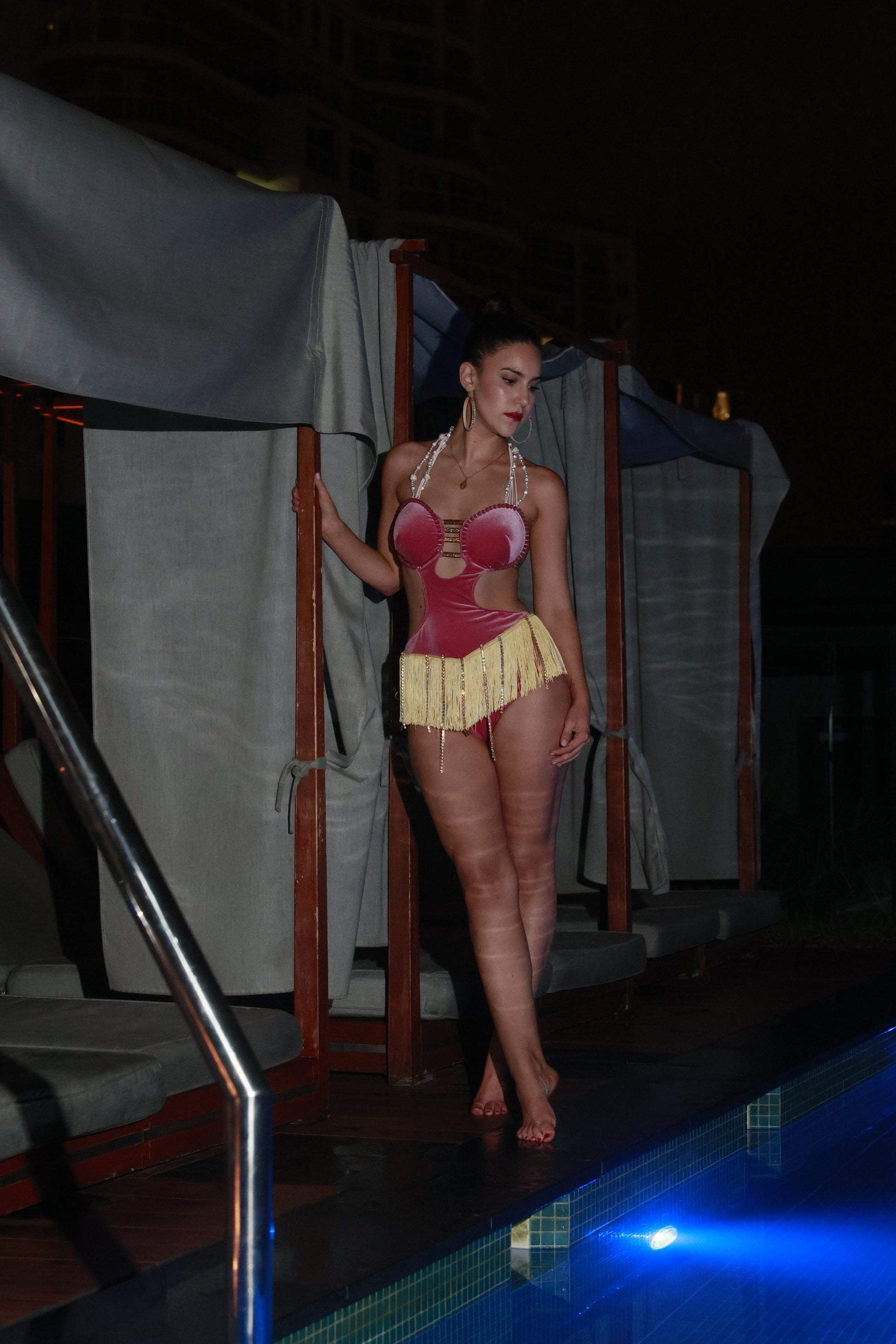 Make a statement in this Satin Blush Jumpsuit with Elegant Fringe. The satin pink material adds a touch of luxury, while the light yellow fringe adds a playful and elegant touch. This jumpsuit is perfect for any occasion, from formal events to nights out.